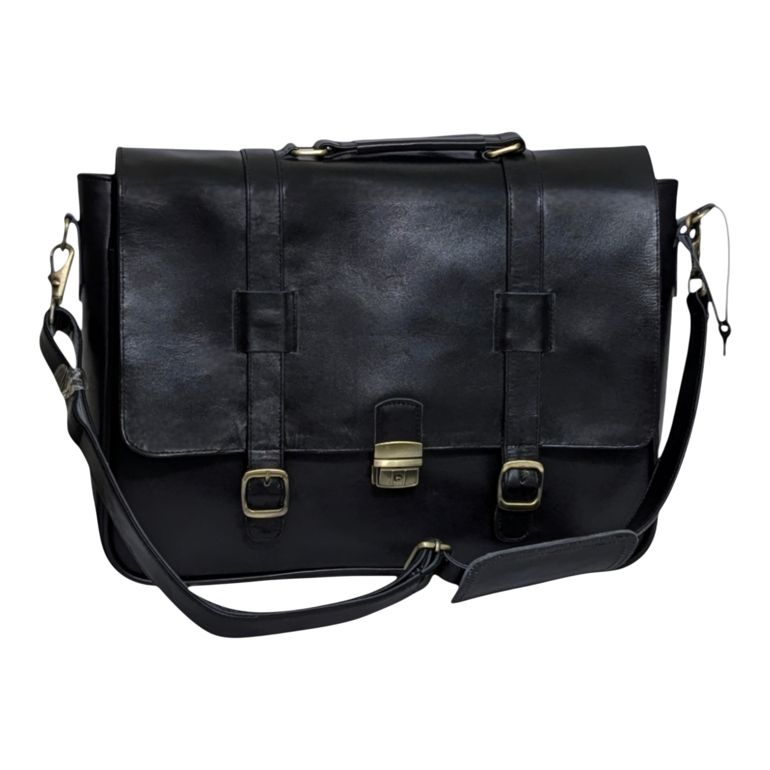 Make a statement with this timeless black leather laptop bag, crafted from premium, smooth genuine cowhide. Its classic briefcase/messenger style features a sophisticated front flap with decorative buckles and a central metallic clasp. Perfect for professionals, students, or anyone needing to carry their tech and documents in style. It offers a comfortable top handle and a detachable, adjustable shoulder strap for versatile carrying.