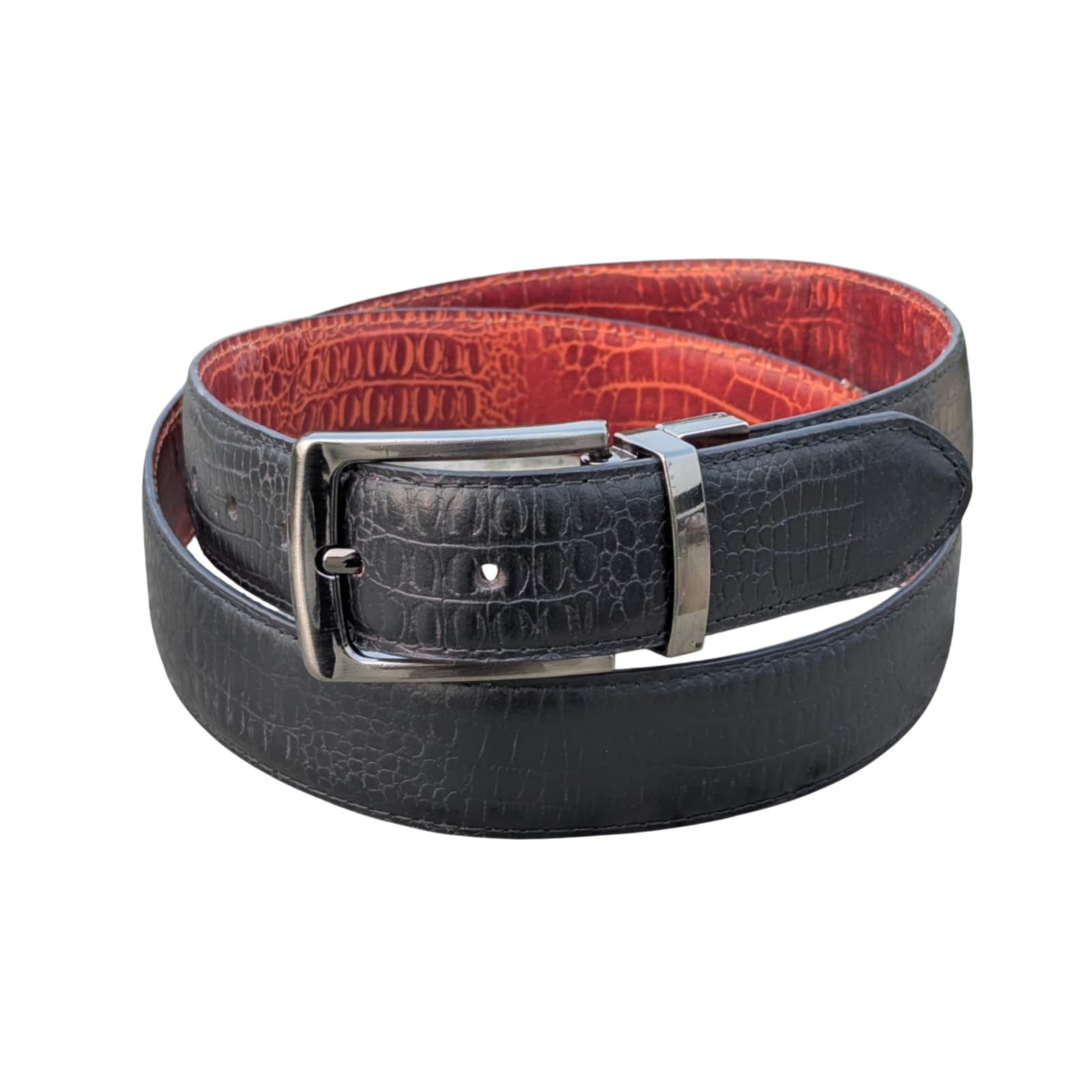 Get two belts in one with this stylish reversible men’s belt! Crafted from premium cowhide leather and featuring a sophisticated crocodile embossed texture, one side is a rich tan/brown, while the other is classic black. Easily switch your look to match any outfit with its rotating buckle. This high-quality belt offers exceptional durability and a premium feel, perfect for both formal and smart casual wear.