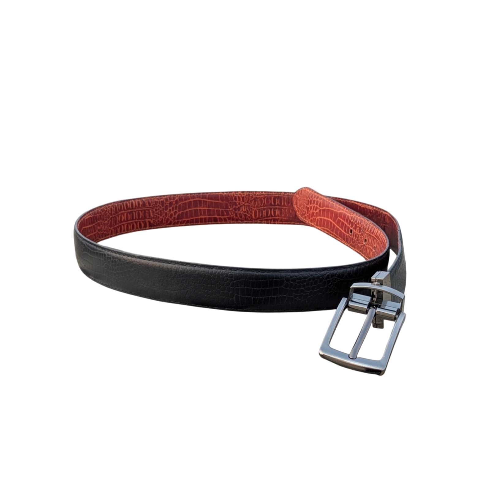 As a designer, my aim was to craft a men’s belt that redefines versatility without compromising on sophistication. This reversible belt, made from premium cowhide leather, is a testament to innovative design fused with timeless craftsmanship. One side boasts a rich tan/brown hue with a crocodile embossed texture, exuding warmth and boldness, while the reverse offers a sleek, classic black for understated refinement. The rotating buckle, meticulously engineered for seamless functionality, allows you to effortlessly switch between colors to suit any occasion. At 1.4 inches wide, the belt strikes a perfect balance—substantial yet refined, enhancing both formal suits and smart casual looks. Every element, from the luxurious leather to the embossed texture, was chosen to ensure durability and a premium feel, making this belt not just an accessory but a dynamic wardrobe essential for the modern man.