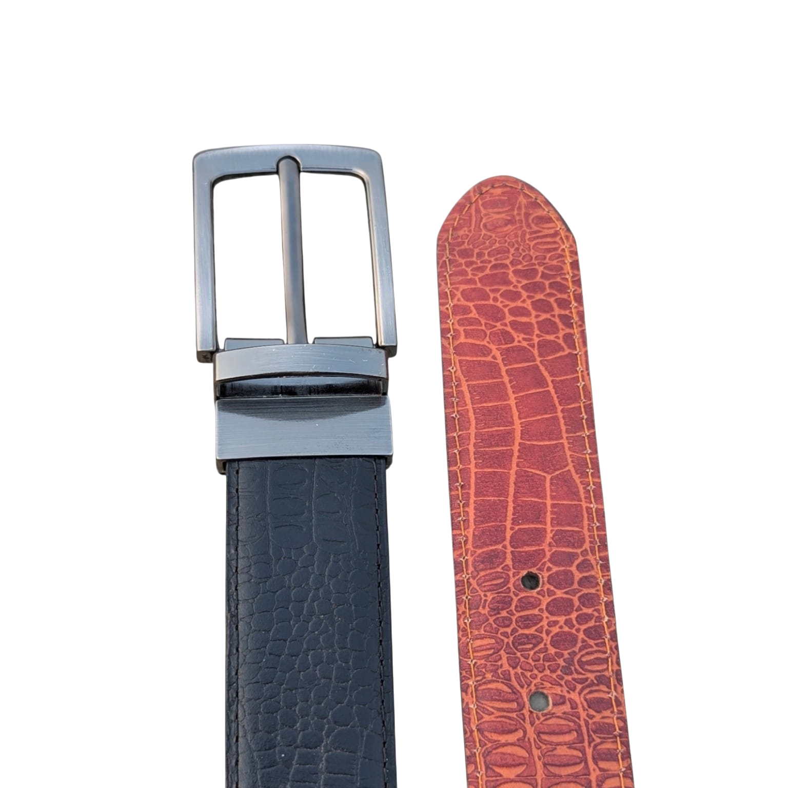 Dual-Sided Craftsmanship: Premium cowhide leather with a crocodile embossed texture, reversible in rich tan/brown and classic black.